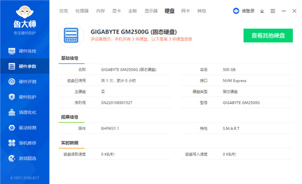 鲁大师检测的数据,磁盘使用1次,容量为500GB,再次确认新盘,至于其他的信息看看就好。