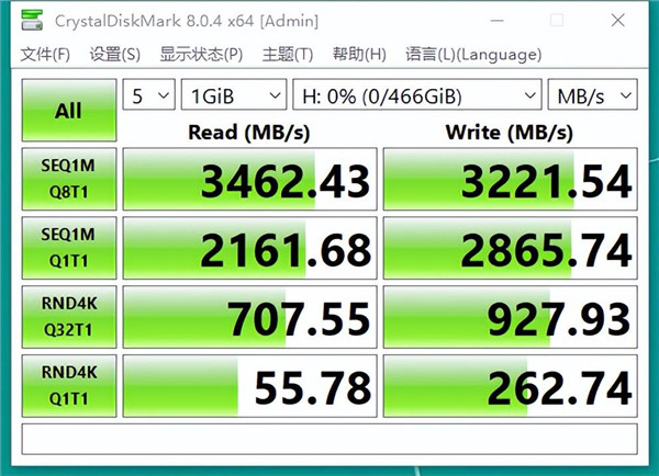 接下来是CrystalDiskMark测试,基础读取速度3462MB/s,写入速度3221MB/s,表现也是相当亮眼。