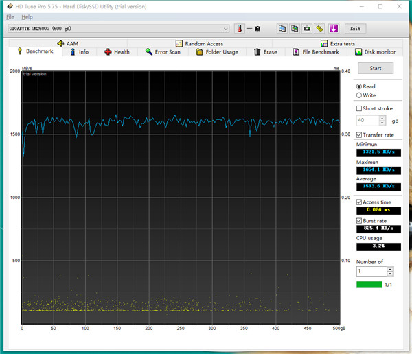 HD Tune Pro硬盘检测工具是一款小巧易用的硬盘工具软件,其主要功能有硬盘传输速率检测,健康状态检测,温度检测及磁盘表面扫描等。另外,还能检测出硬盘的固件版本、序列号、容量、缓存大小以及当前的Ultra DMA模式等。我们这里只是单独测试了读取表现,可以看到从0到500GB,整体表现都是非常平稳,在1600MB/s左右,并没有出现掉速的情况,这或许就是得益于主机内存缓冲区功能。