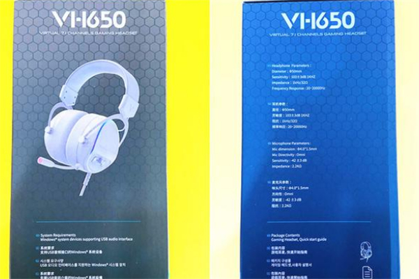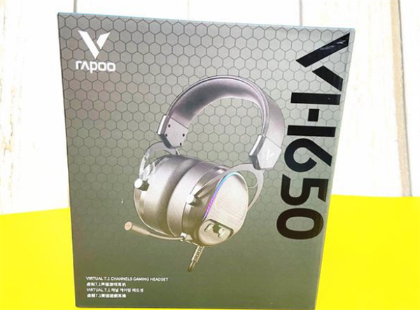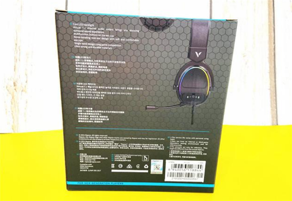 包装采用了雷柏一贯大气明朗的风格,正面印有产品的实物图,左上角是品牌的LOGO,右边是产品的型号告知,最下方告知我们这是一款支持7.1虚拟声道的游戏耳机。