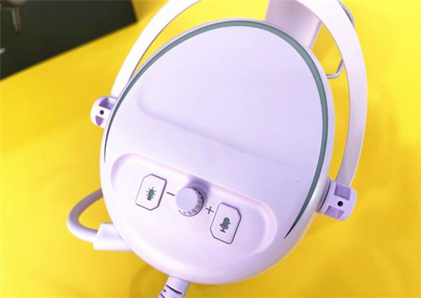 左耳罩和右耳罩一样,但是雷柏巧妙的把耳机所有的按键都设计在了耳罩上,,分别是RGB的开关键,和静音键,中间的旋钮则是调节音量大小的。