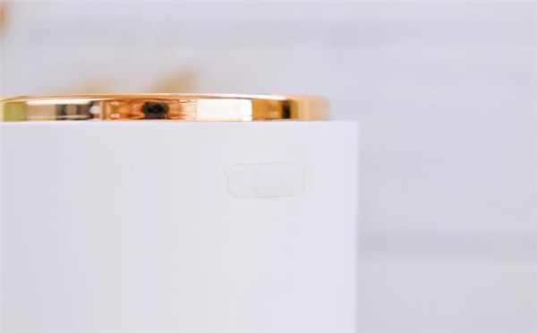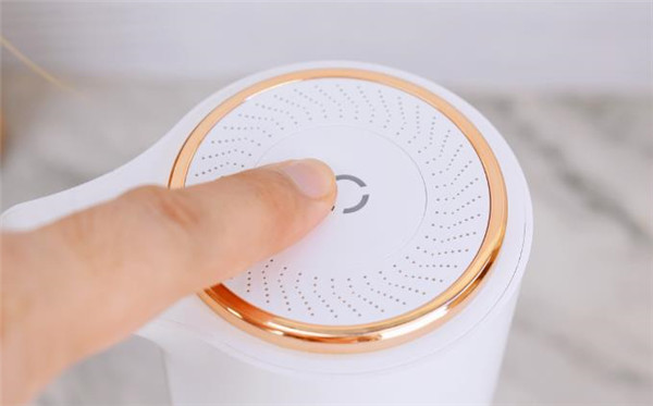 再从俯视的视角来看这款自动泡沫洗手机,顶盖中央是开关按键,也是调节档位的按键。长按2秒白灯量就代表开机了,然后依次单击切换档位一档/二档/三档。按键区的金属圈盖子是可以直接取下来的,这个是香薰盖,上面这些细密的孔其实是香薰出味的孔。我们可以直接在香薰片上滴精油,这样洗手的时候,就能感觉芬芳味扑鼻,空气清新。