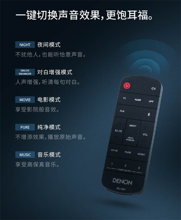 此外,天龙HOME 550还配置到一款遥控器,除了顶部常规的电源与静音键之外,下放还依次包括了输入源选择、低音响度调节、总音量调节、对白增益调节、声场模式调节等等按键,非常的全面。与常规回音壁相比较的话,天龙HOME 550还具备到更多的音效模式,例如夜间模式、对白增强模式、电影模式、音乐模式、纯净模式,让用户可以体验到更多不同的音效输出,更契合自身喜好。