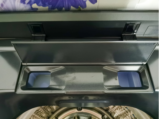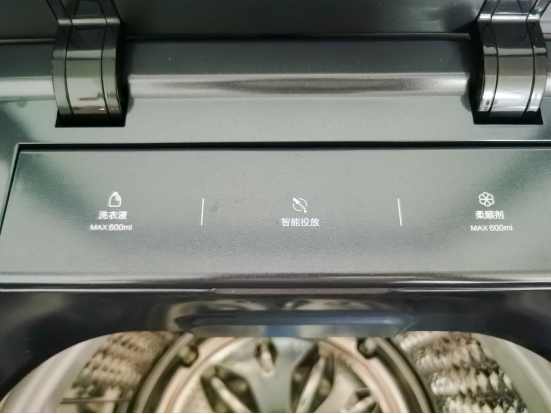 洗衣机内筒顶部里侧上方设计了洗衣液与柔顺剂投放盒,拥有600ml+600ml柔顺剂存储量,通过搭载的AI智能双投技术,洗衣机能够自动感知衣物重量,智能反馈投放盒,精准自动投放洗涤剂及柔顺剂。在我看来这是一个极具人性化的设计,往投放盒加入洗涤剂之后我们再也不用担心每次洗衣服时的洗涤剂放多还是放少的问题,非常地方便。