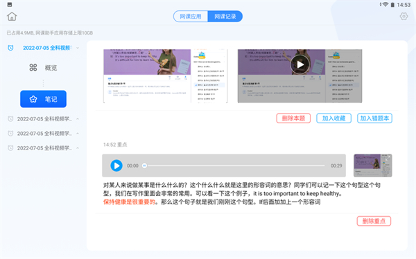 课后我们可以查看网课记录,里面便会直接显示上课时记录的难点,并且通过AI语音自动将录音转化成文字,即便是英文也能单独记录,并标记出重点内容。即便不是在线下的课堂上或者没有老师的情况下,在学习过程中再也不怕重难点记不住、有问题没人教的情况了。