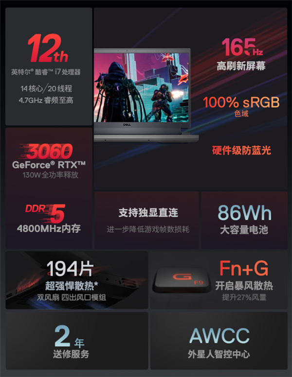 86Wh大电池,雷电4接口是Intel平台的优势,AWCC外星人智控中心也相当便利,服务方面戴尔提供两年原厂送修。