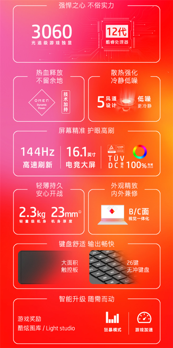 惠普暗影精灵一直是高品质游戏本的代名词,现在也来到了12代酷睿,可选i7-12700H、i5-12500H。RTX 3060显卡支持独显直连,但没有明确具体性能释放。