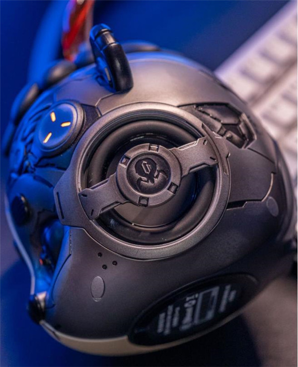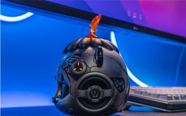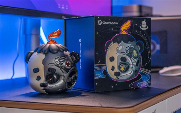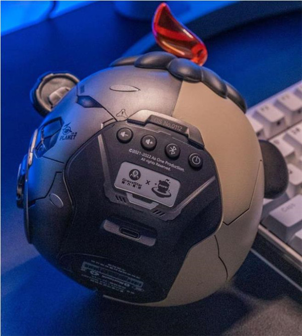 重力星球联名音响正面整体结构从中间划分,扬声器主要集中在面部右侧(他人视角)。播放音乐时,低音澎湃。眼睛、头顶和太阳穴部位都可以发光,夜晚使用的时候会很舒适,很温馨。