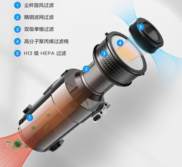 美的智能吸尘器Z7更是搭载了「五重过滤系统」,由尘杯旋风过滤、精钢滤网过滤、双级单推过滤、高分子聚丙烯过滤棉和 H13 级 HEPA 过滤组成。此外,其还支持美的自研的气旋压缩技术,最小可拦截 0.3 微米颗粒,能过滤掉空气中 99.97% 的灰尘。