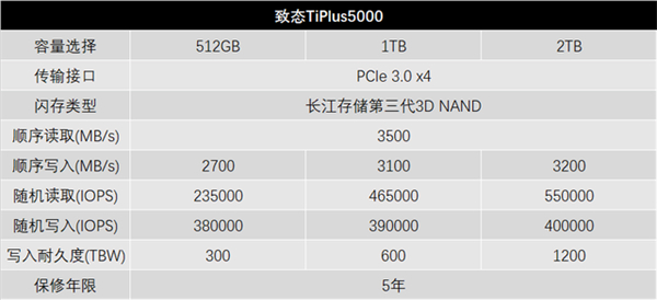 致态TiPlus5000 2TB的读写性能得到提升,写入耐久度指标也达到了1200TBW,相当于5年保修期内每天可写入650GB以上的数据,即便是重负载大强度使用也能后顾无忧,下面就让我们一起来看看致态TiPlus5000 2TB的使用体验吧~