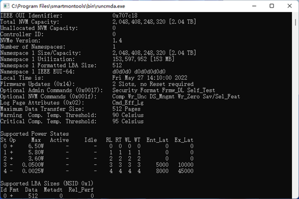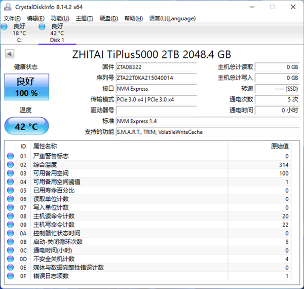 Smartmontools可以提供APST自主电源状态转换预设。致态TiPlus5000 2TB支持五种电源状态(3种活动状态+2种非活动状态),PS4状态功耗不高于2.5mW。