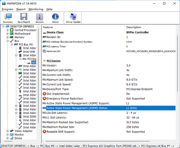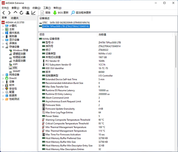 AIDA64显示致态TiPlus5000支持RTD3(运行时D3)状态,进入延迟2秒,退出延迟100毫秒,符合微软现代待机要求。当SSD进入RTD3状态时,主控将断电以实现空闲零功耗。