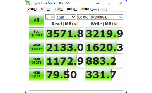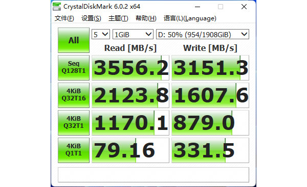 CrystalDiskMark主要是为了检测SSD的理论读写带宽,致态TiPlus5000 2TB使用了1600MT/s的长江存储第三代NAND闪存,可以在四通道主控下轻松跑满PCIe 3.0 x4带宽。