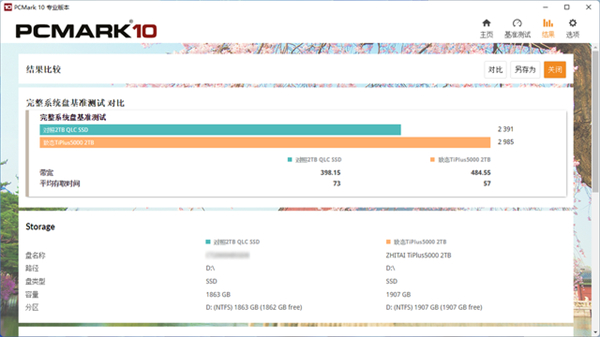 致态TiPlus5000 2TB在3DMark存储测试中取得3139分,高于对照2TB QLC SSD的2896分。