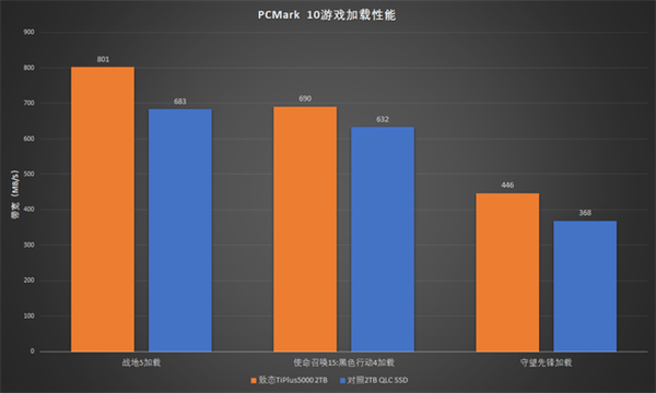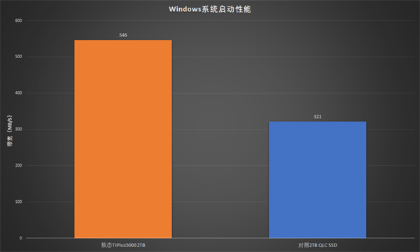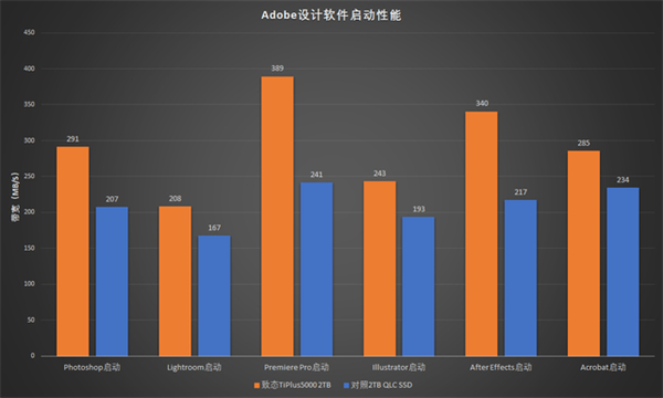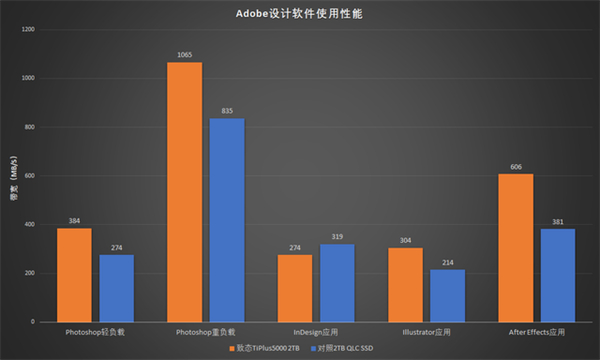 目前可对照的2TB SSD样品不多,这里对比了一款2TB容量的QLC型号作为参照。从系统启动、游戏加载、设计软件启动到设计软件使用过程,使用TLC闪存的致态TiPlus5000 2TB优势都非常明显。