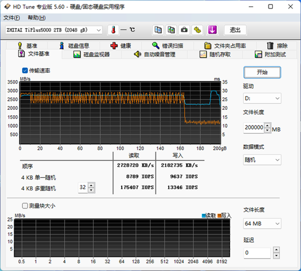 使用随机内容数据填充50%盘内空间,HDTune文件基准测试显示此时TiPlus5000 2TB仍然能提供大约150GB容量的SLC写入缓存: