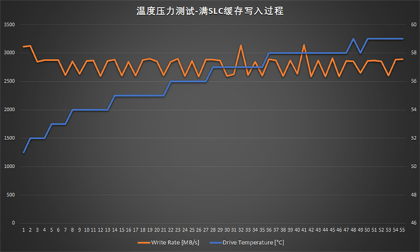 致态TiPlus5000 2TB的实用SLC缓存容量较大(150GB),温度压力测试环节分成两种情况进行,首先是150GB全SLC缓存写入过程:室温24度,关闭节能特性后待机温度显示47度,测试结束后温度上升到59度,写入过程中未出现过热限速。