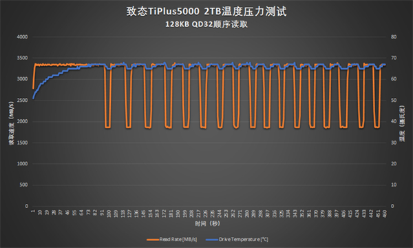 接下来是128KB QD32顺序读取压力测试。测试开始96秒后开始过热限速,对应温度读数67度。限速6秒后温度下降到65度,限速解除,全速读取20秒后再次触发过热限速。此后基本上都是限速6秒、全速20秒交替。