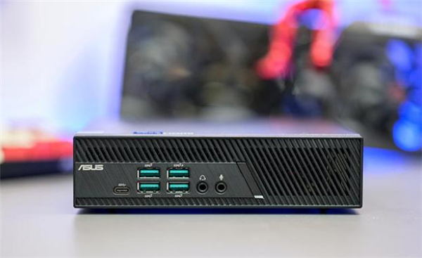 主机采用了金属外壳,做工还是相当精致的,无论是摆放在那边,还是轻轻抚摸,都有着不错的质感。虽然身形小巧,但是在接口上,华硕PB62给到的还是非常足的,前面板提供了四个USB 3.2 Gen2 Type-A接口和一个USB3.2 Gen1 Type-C前置接口,以及3.5mm耳机和麦克风接口。