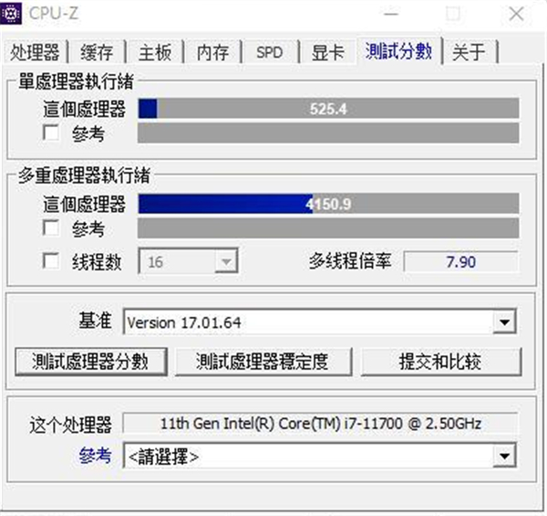 使用CPU-Z进行一下测试,单核525.4分,多核4150.9分,也算是正常的表现。