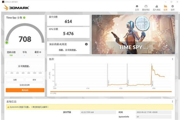 虽说不是定位游戏需求的产品,我们也进行了相应的测试,3DMARK Time Spy测试,分数708分,显卡分数614分,CPU分数5476分。