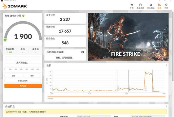 而3DMARK Fire Strike测试,得分1900分,显卡分数2237分,物理分数17657分,综合分数548分。