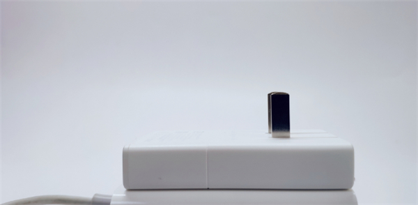 充电器供电部分双插脚,采用折叠结构,这么纤薄的身材标准双脚插倒是显得略显突兀,搬开脚插呈90°即可使用充电,特意使用有安全保护的插线板进行插接使用,多次插拔手晃动插脚未出现松动情况,收纳插脚的充电器可以随意放置在笔记本内胆包,随身包甚至口袋中。