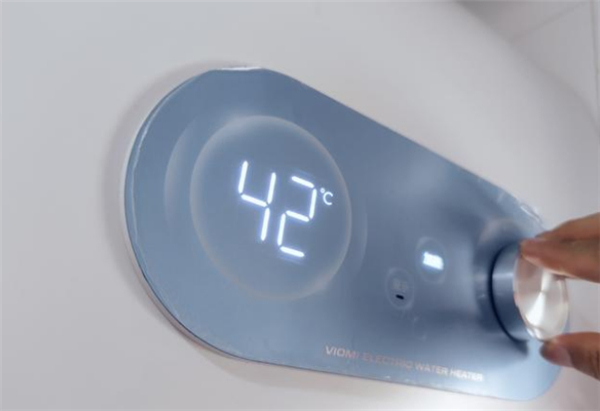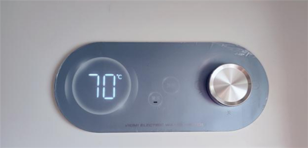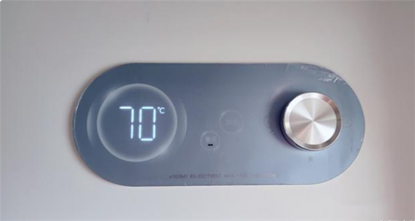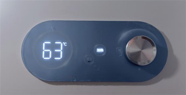 云米这款Air2 mini热水器操控面板是浅蓝炫彩大屏,从左到右依次为数码管实时显示当前筒内水温,漏电警示灯,警示灯亮起表示地线带电需要进行及时整改,再往右是加热指示灯,热水器处于加热状态是此灯亮起,当加热到设定温度时加热指示灯熄灭。最右侧是整个热水器的温度调节旋钮,顺时针关-低-高指示调节,经实际体验可知,“低”处为45℃左右,“高”处最高为75℃,常温到75℃无级调节。