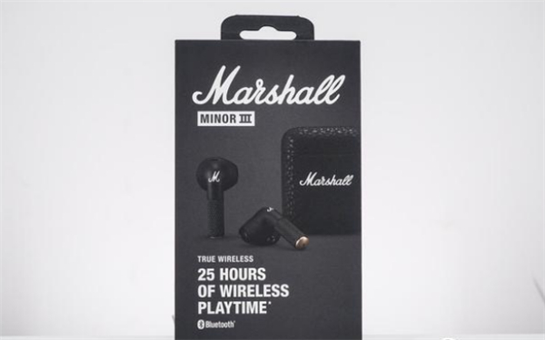 Marshall Minor III外包装延续了耳机产品线瘦长方盒的包装风格,采用浅黑色背景,底部抽拉式结构。正面展示有产品外观渲染图、产品名称Marshall Minor III、25小时续航和蓝牙标志。
