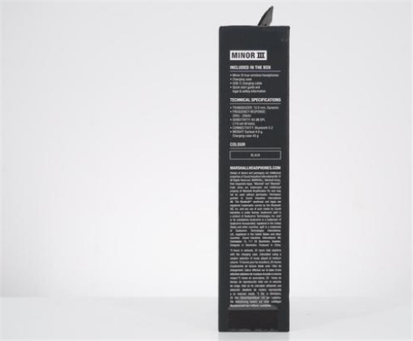 包装盒侧面印刷了包装清单及产品技术规格介绍。包装清单如下:Marshall Minor III耳机本体,充电盒,USB-C充电线,快速上手指南&安全指南。