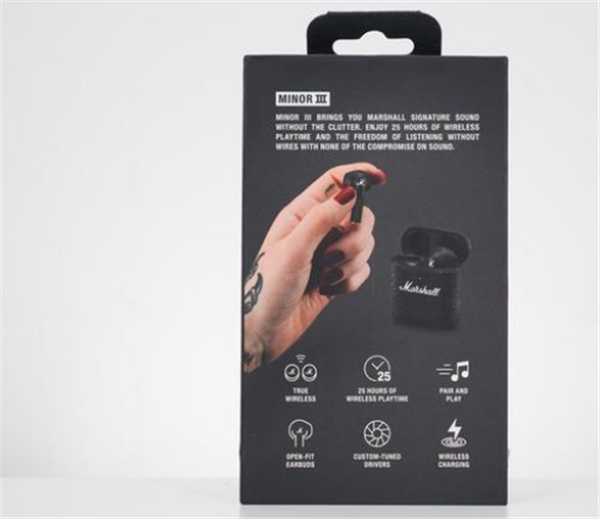包装盒背面对产品的信息进行了文字及图文介绍产品相关信息,主要信息如下:Marshall Minor III采用Marshall标志性调音,25小时长续航,采用定制调谐驱动单元,支持无线充电。