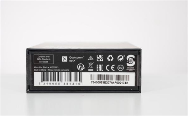 包装盒采用了抽拉式设计,底部贴有各种认证、环保标识及产品条形码以及产品支持高通Qualcomm aptX自适应音频传输技术。