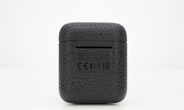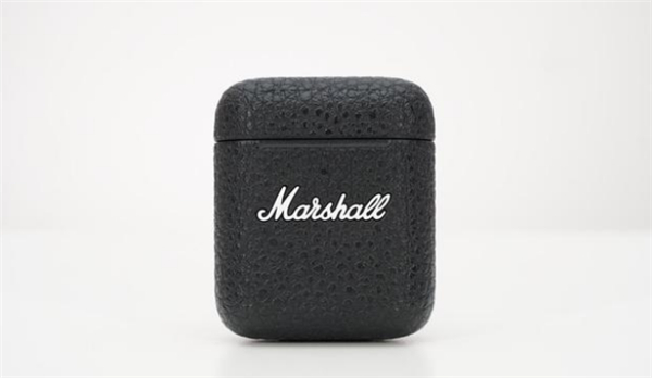 耳机充电盒整体设计为圆角方盒造型,外表由荔枝皮花纹的仿皮革材质包裹。在充电盒上盖处还设计了方便手指开合的凹槽,凹槽下方则是充电指示灯以及Marshall的品牌logo。