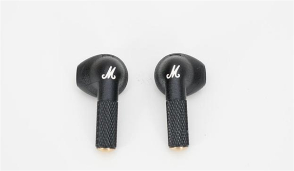 耳机采用柄状半入耳式设计,耳机柄下侧进行了交错纹路设计,让用户在调整耳机佩戴角度的时候有更好的手感。耳机柄上半部分则是类似于磨砂黑的设计并印刷有Marshall标志性的“M”字。