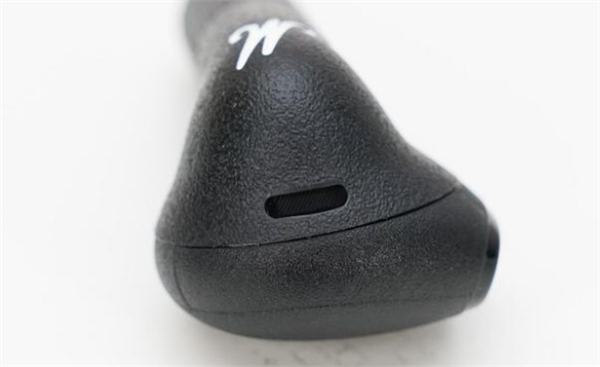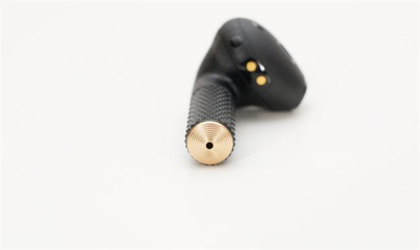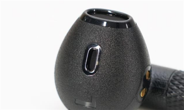 耳机柄的底部设计了金色的盖片,盖片正中间的开孔为耳机的主麦克风开孔,为耳机的通话/语音提供拾音功能。