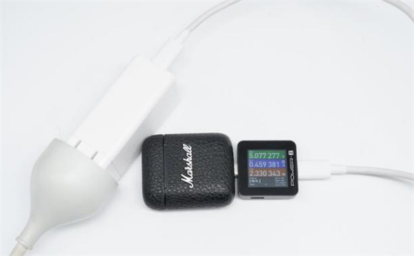 我们采用CHARGERLAB POWER-Z KM002C对Marshall Minor III半入耳式真无线耳机评测进行有线充电测试,充电电压约为5.08V,充电电流约为0.46A,充电功率约为2.33W。