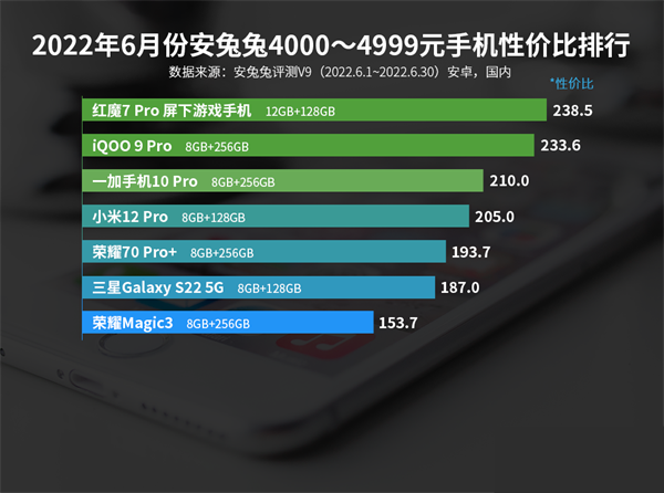 注:按照性价比上榜标准,本次4000-4999元价位段仅有7款手机上榜。