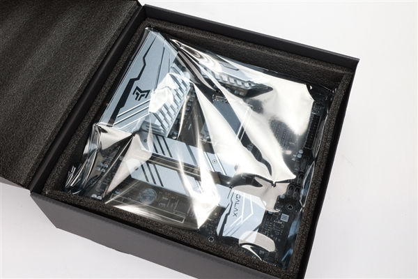 打开主板包装盒,我们就能在第一层发现由静电袋保护着的影驰 B660 金属大师主板本体。