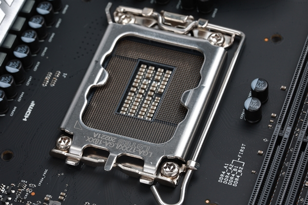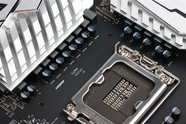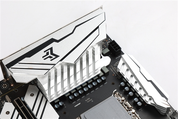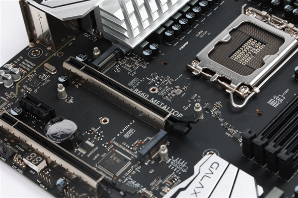 在主板左上角,B660 金属大师主板专为VRM区域配备了两个巨大的金属散热装甲,以保证供电区域的稳定运行。