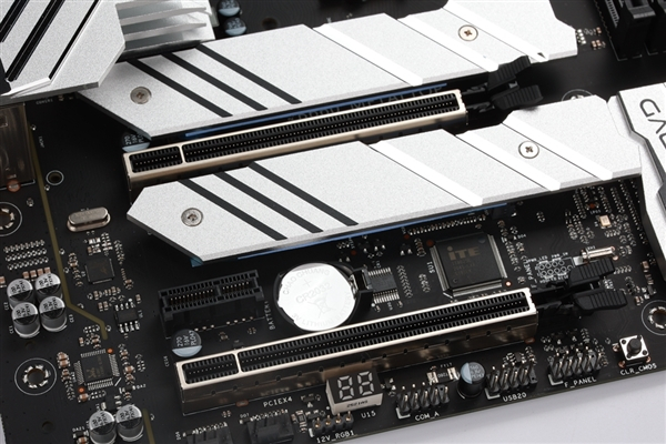 上方M.2接口为CPU直连,下方M.2接口则连接的南桥芯片组,支持PCIe4.0协议,最大支持2280固态硬盘。