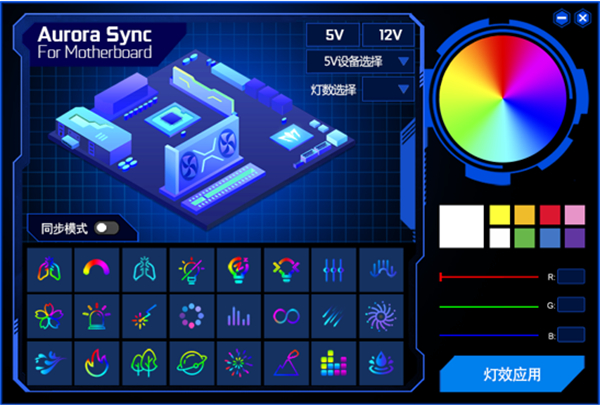 此外,玩家可通过金属大师主板配备的5V ARGB接口和12V RGB接口,搭配灯效控制软件Aurora Sync实现灯效同步调控,20多种灯光特效,随心调配。