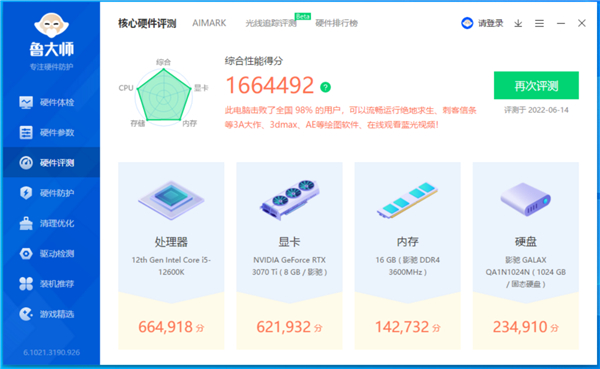 首先是鲁大师娱乐跑分,CPU得分664918分,显卡得分621932分,电脑综合性能得分1664492分,性能得分非常优秀。