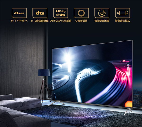 为了保证更加沉浸的影音体验,电视还搭载了Conchs Sound音箱,它拥有更大的腔体,功率也更大,同时还配置了Dolby和DTS解码技术,可调节各频段的声音,让整体音质显得澎湃震撼高保真,犹如身临其境。