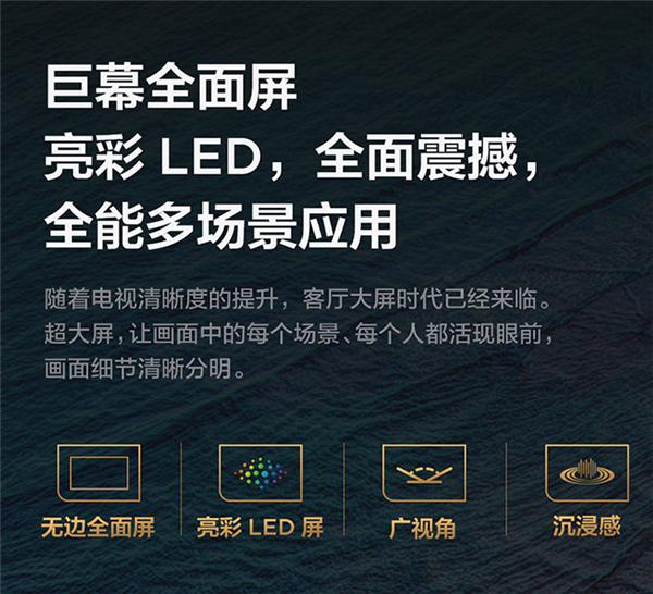 随着电视清晰度的提升,客厅大屏时代已经来临。超大屏,可以让画面中的每个场景、每个人物细节都活现眼前,沉浸感十足。因此TCL 85Q6E电视搭载一块85英寸亮彩LED巨幕全面屏幕,还支持有线和无线投屏,静置时它是家饰品,使用时瞬间成为巨幕影院。