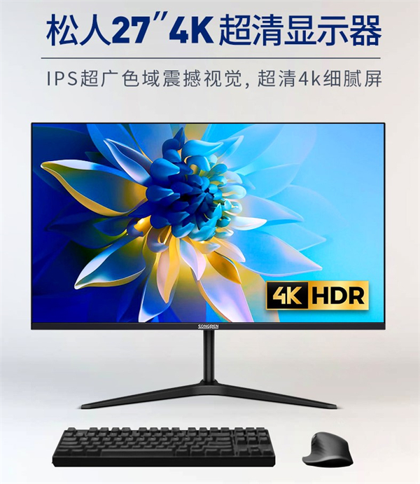 松人T270LG 27英寸4K显示器,采用IPS原装面板,sRGB色域覆盖达到138%,满足专业设计图形编辑处理的要求,支持60Hz稳定运行4K+HDR,具有178°超广视角,同时具备DC爱眼不闪屏功能。该商品采用1000:1对比优化技术,16:9影院级宽屏比,最大支持3840×2160分辨率,显示精度高达163ppi,支持AMD Freesync技术以及兼容部分NVDIA G-SYNC技术,给玩家带来更好的游戏体验。该商品不仅外观采用三面微边框设计,在接口方面也是一应俱全,配备HDMI、DP、音频、DVI等接口。