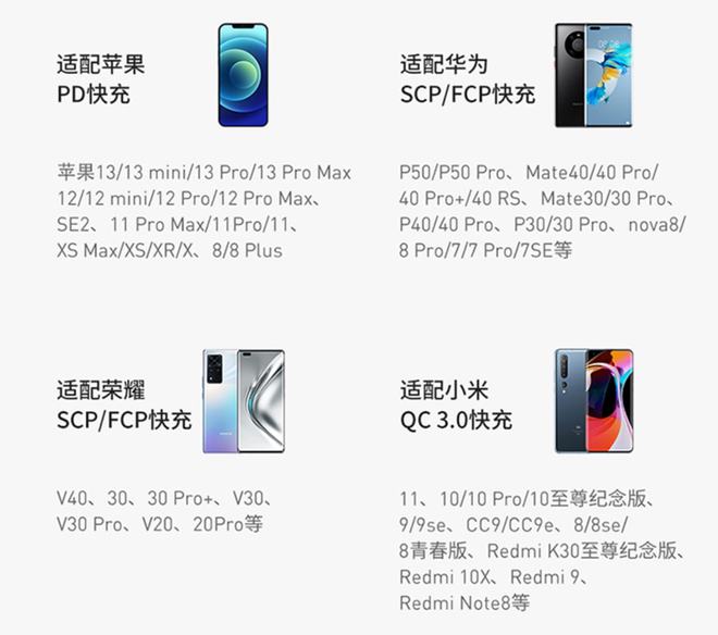 众所周知苹果手机是没有快充,如果想快速充满手机,只能选择充电速度较快的充电头和充电线。倍思充电宝自带约19cm长的苹果20W快充线,支持9V/2.22A 20W快充,大概30分钟能充至50%电量(iPhone 13型号)。这个充电速度比起苹果原装数据线快一些,尤其适合救急。另外倍思充电宝还适用于华为22.5W SCP/FCP快充、荣耀 SCP/FCP快充、小米QC 3.0快充、三星AFC快充等等,适配手机型号也比较多,直接放图啦!