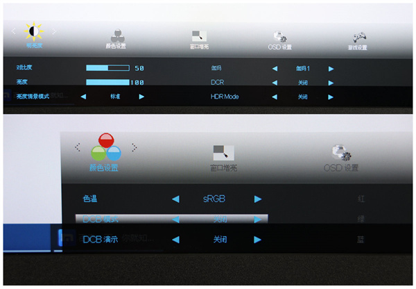 ▲OSD菜单方面是AOC的经典样式,整体UI保持了家族式的设计,逻辑上也比较明确,体现了AOC作为一流大厂该有的水准。OSD菜单中提供了sRGB色域切换功能,但并不是无损的,会锁定亮度到70%。