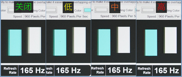 在关闭状态下,大约是一层半拖影,此时的GTG响应时间大约是5ms,可以推断这块面板的原生GTG就是5ms。在开启OverDrive加压后,响应时间进一步被压缩,在低和中档位,都能看到拖影层逐渐在变淡,中档位已经只剩一层了,此时的响应时间大约在3.7-4ms左右,高档位已经出现了红色鬼影,说明像素错率已经开始飙升。