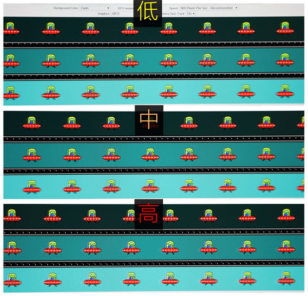 ▲在UFO拖影测试中,中档位的表现最佳,拖影层几乎不可见,高档位已经明显能看到飞碟的鬼影了,属于不可用状态。因此Q24G2的最佳档位就是“中”,建议长期挂在该档位使用。