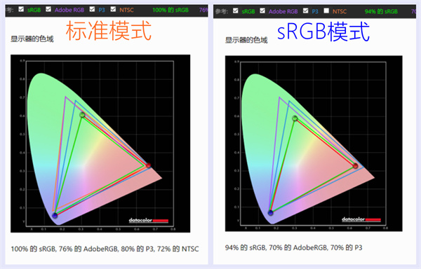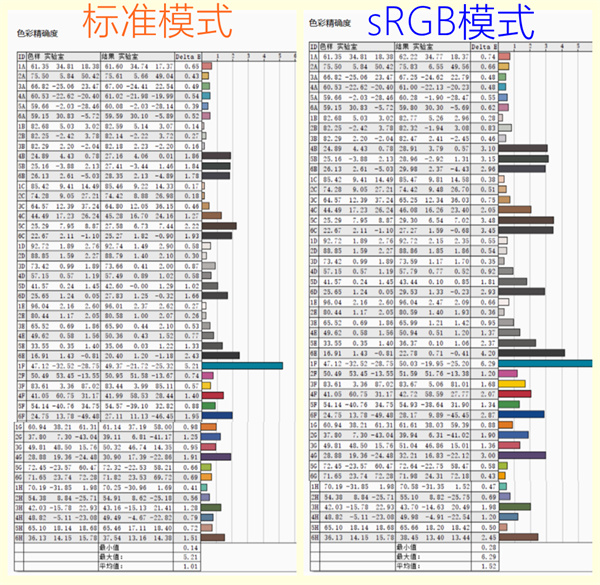 因为机身提供了sRGB色域缩限,所以做了两种模式下的对比。